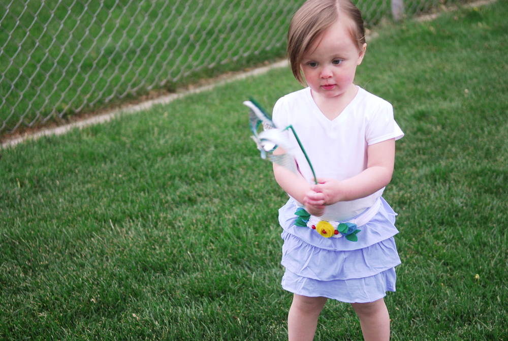It's that time of year again the time the sun shines in through our window beckoning us to come out and play. I find myself spending my whole day outside with the kids and when very little time left for crafting, so I am all about the quick projects. Like this one today. Starting with a basic ruffle skirt I picked up at Walmart for $3.50 I simply added a little tie belt and I had a new little skirt.